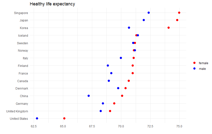 かなり衝撃的なのがアメリカ。何と男性は平均して62.8歳、女性は65.1歳で健康寿命が尽きるという結果。まぁ確かにアメリカ人は全体的に肥満が多く、また公的健康保険も整備されていないため、貧困層は簡単に医者にかかれないという問題があります。そこに加えてオピオイドなどの薬物問題もあり、社会階層が上のほうはジム通いで無茶苦茶に健康だが、下の方は健康的な生活とは無縁という状況かなとは思います。