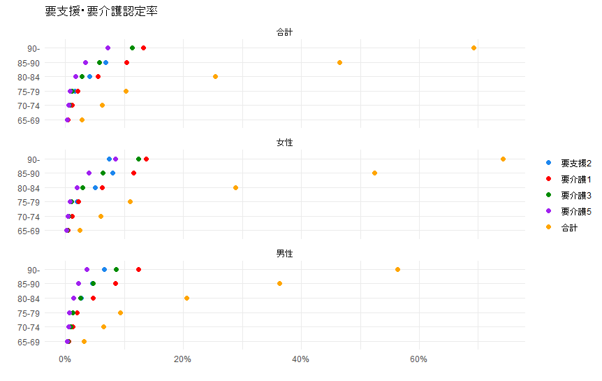 これだと、例えば男性の場合、70~74歳の段階で要支援2の認定は0.9%、要介護1は1.2%、要支援1~要介護5まで何らかの認定を受けている人をすべて足しても6.5%です。80~84歳になると、要介護1で4.7%、要介護3で2.6%等と上がりますが、すべての認定を足して20.6%。高くはなりますが、それでも5人に1人です。「平均」と比べて考えるため、半分以上が何らかの認定を受けるのをベンチマークと考えると、90歳以降という感じです。