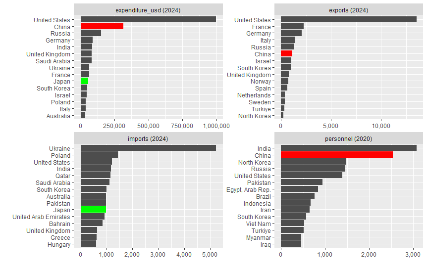 まずは最新年(兵員数は2020年、金額データは2024年)で、各項目の上位15カ国を並べてみました。軍事費、輸出入は百万ドル、兵員数は1000人単位です。