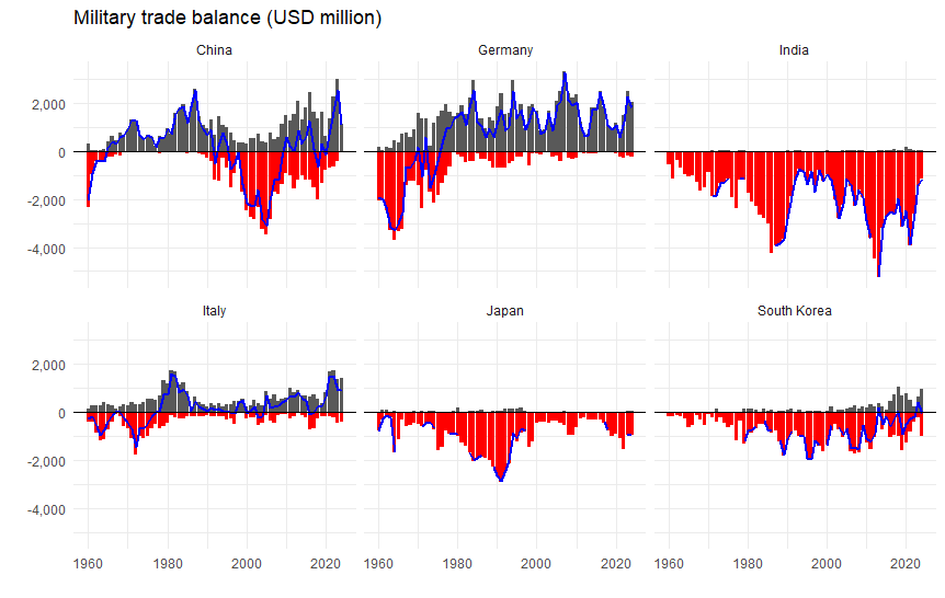 日本は言うまでもなく赤字続き。1990年頃まで赤字が拡大したのが、その後、急減しているのは、恐らく当時の貿易黒字批判に対応するため、アメリカからせっせと防衛装備品の輸入をしていたことを示しているのでしょう。この時期、わずかながら輸出があるのは、恐らくアメリカとの戦闘機の共同開発関連じゃないかと思いますが、間違っていたらごめん。