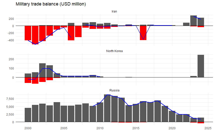 ここで念のためにロシア関連を見てみます。ロシアはやはり2022年のウクライナ侵攻以降、武器輸出が急減し、23~24年には若干の輸入もしています。