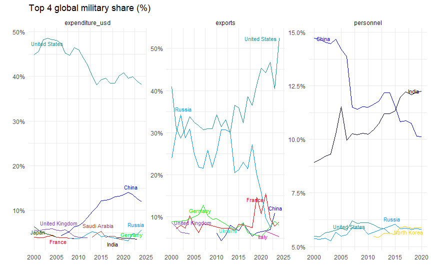 最後に軍事関連での世界シェアの推移を簡単に見ておきます。2000年以降の期間で、データが部分的にしかない国は除いて軍事費、輸出、兵員数で各国のシェアを計算し、各年のトップ4を抽出して推移を見たものです。トップ4が常に同じではないので、国は途中で出たり入ったりしています。輸入トップ4は比較的目まぐるしく変わるため、グラフの見やすさの観点から除外しました。