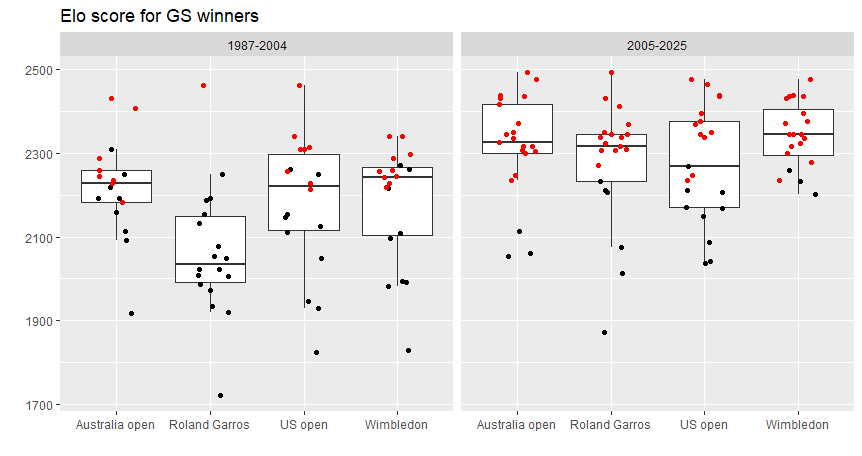 ということで、何かデータで見られないかと思い、以前も使ったEloスコア(男子、女子)というやつを使ってみようと思います。過去に遡っての全試合結果を引っ張り出して、このスコアを全プレイヤーについて計算し、各グランドスラムで優勝者のスコアに違いがあるのか(あったのか)を調べてみました。まぁ、オフィシャル・ランキングのほうが分かりやすいのですが、過去に遡ってデータを揃えるのも面倒だったので、以前に作ったデータの再利用に逃げました。