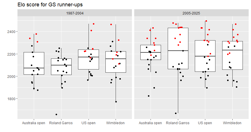 因みに準優勝者(runner up)のスコアを見てみると、ここでもビッグ3前の時代で全仏スコアが若干低いのですが、優勝者ほどの差はないようです。面白いのは、ビッグ3時代になると、むしろ中央値では全仏のスコアが最も高くなる点。まぁ、この時代だとフェデラーとジョコビッチが4回ずつ、準優勝に名前を連ねているので当然とも思えます。