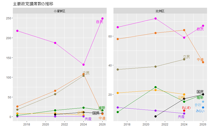 小選挙区はどうしても大政党に有利ですが、自民が比例区で伸ばせない中、中道の落ち込み分を維新、国民が取り込めなかった(参政やチームみらいに奪われてしまった)というのは、やはり鮮度が落ちてきたということか。自民の争点潰し戦略に負けたという要素もあるでしょうが、やはり毎回、バズるテーマを作り続けるというのは大変です。