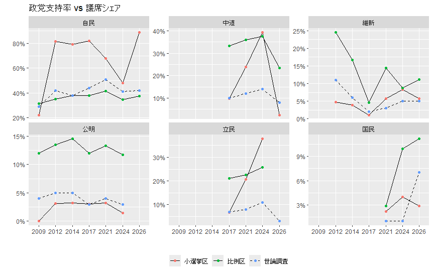 一方の中道は、議席数で見た通り、比例区について政党支持率以上の議席を得る傾向にあります。小選挙区の上下動が極めて大きいのは、自民のシェア変動の裏返しということでしょう。特に前回2024年の結果は「出来過ぎ」だったと言え、これが元に戻っただけ(もう少し低いが)という見方もできます。この辺りは、投票行動の小さな違いで結果が大きくブレる小選挙区制の怖さだと思います。
