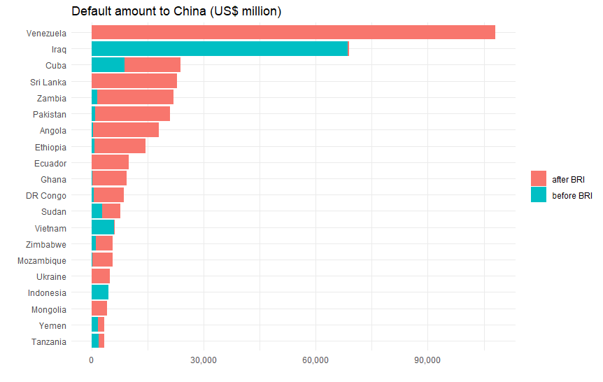 さて上のグラフで中国向けのデフォルト額(緑色部分)を見ると、2000年頃から目立ち始めますが(実際には1967年からインドネシア、71年からタンザニアなどのデフォルトあり)、大きくなるのは2020年前後からです。「一帯一路」が始まるのが2013年なので、その頃から多額の貸し付けを行ったのが、直ぐに返済に行き詰ったと考えてよさそうです。