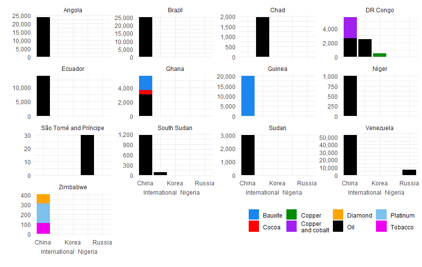 2004~18年に締結された融資契約のうち、資源を返済担保にしている契約52本について、融資国、借入国、金額、担保資源等について整理したものです。債務国別に、横軸に債権国、またグラフの色で担保となった資源の種類を示しています。あくまで情報が得られた契約を抽出しただけなので、これがすべてではありません。