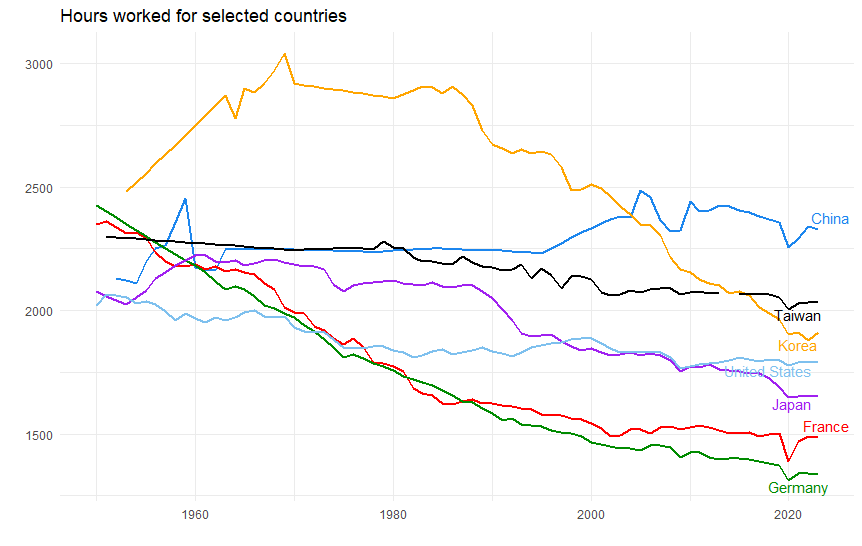 台湾は微妙に低下傾向があるとはいえ、ほぼ横ばいというところ。中国もこの10年余りで見れば、若干の低下傾向にはありますが、それでも総労働時間は非常に高い水準で高止まりしています。