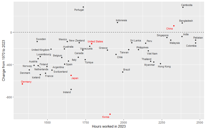 同じデータですが、少し見せ方を変えてみます。横軸に2023年の労働時間、縦軸に1970年からの変化幅をプロットしてみました。
