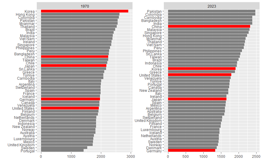 これが2023年になると、トップはパキスタン、これにコロンビアがわずかな差で続きます。両国は1970年にも3位、4位でしたので、長時間労働の常連組と言ってよさそうです。一方、先に見た通り、1970年トップの韓国は労働時間を大きく短縮し、20位になっています。アメリカは22位と、ほぼ真ん中、そしてドイツが最下位となってしまいます。逆に1970年最下位のポルトガルは、2023年には25位と、ほぼ真ん中に上昇しています。この背景は全く不明です。