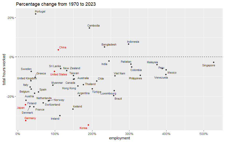 大半の国が労働時間を短縮させていますが、カンボジア、バングラデシュ、中国、インドネシア、ポルトガルは、長時間労働になった数少ない国です。最初の4カ国は、恐らく経済構造自体の近代化という要因もあるでしょう。昔は労働時間という概念が当てはまりにくい農業部門が大きかったのが、工場やオフィスでの始業時間・終業時間がある働き方になったのかもしれません。頑張れば給料が増えるので、喜んで長時間働くという側面もあるかもしれませんし、逆に低賃金の工場労働者としてこき使われるという側面もあるかもしれませんが。
