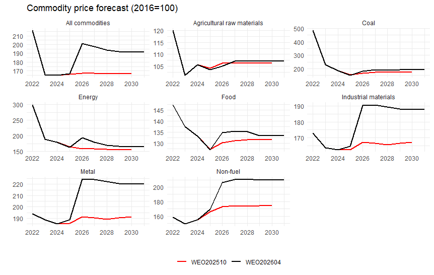 まず商品価格総合(All commodities)で見ると、昨年バージョンでは大きく落ち着いた2023~25年水準が今後も続くと見られていたのが、今年のバージョンでは今年急騰した後も、将来的にあまり下がらない見通しとなっています。