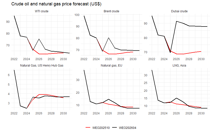 今回のWEOの関心事は、当然ながらイラン問題の世界経済への影響。去年のバージョンはトランプ関税の影響が主関心でしたが、これが思ったほどではないと分かってきたところで、また大きな不確実性が追加されてしまいました。