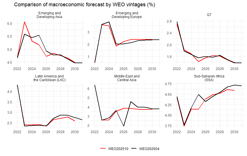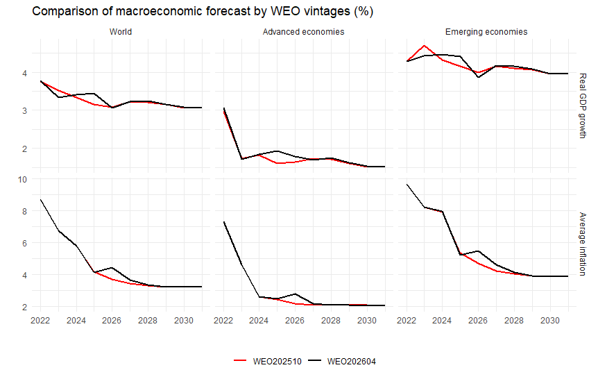 恒例のIMF世界経済見通し(WEO)の2026年春バージョンが出ました。もう少しドラスティックなイラン問題の影響などが見られるかと思ったのですが、まぁ、ほぼほぼ平常運転に近い感じでしょうか。