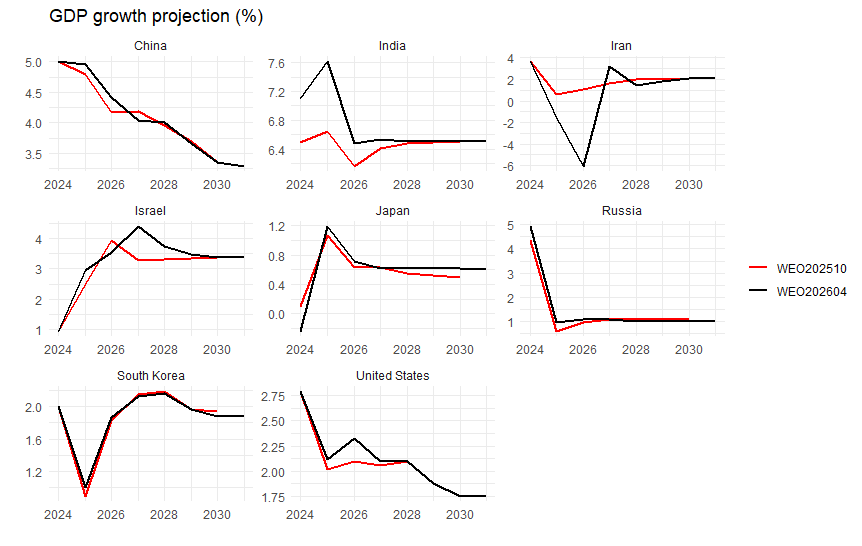 少し報道等より細かく、前回バージョンからの変化等を見てみようと思います。なお今年1月に「WEO update」が出ていますが、そちらは細かいデータベースがないので、以下はすべて昨年10月バージョンとの比較です。