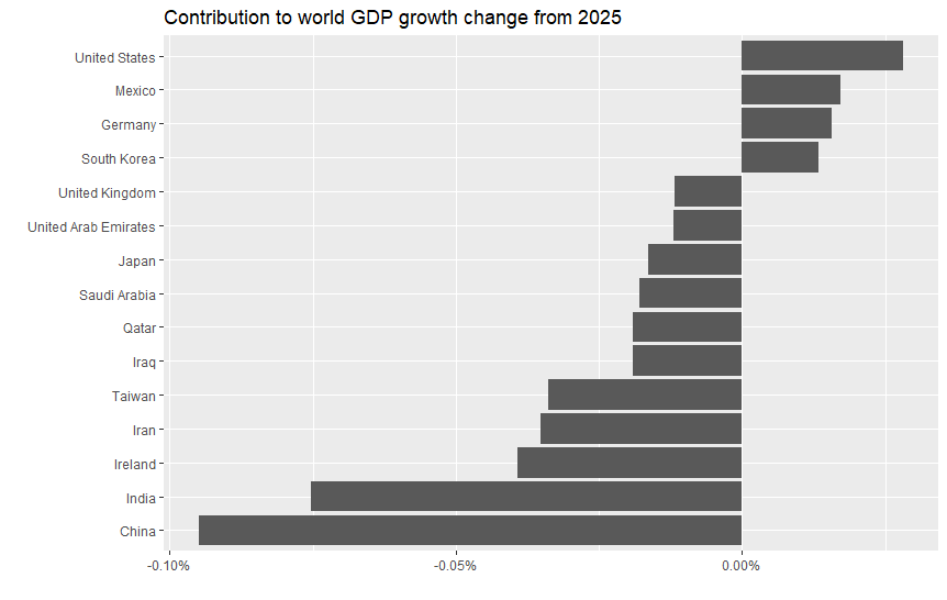 そこで、ちょっと簡単な計算をしてみます。IMFでは各国データをPPPベースのGDPで加重平均して世界全体のデータに換算しているので、2025年と2026年のGDP成長率を各国の寄与度に分解して、その差を計算しました。これにより2026年の0.3%ポイントの成長率低下がどの国の影響かを見たのが、以下のグラフです。絶対値で上位15カ国を抽出しました。当然、経済規模の大きい国が出てくる傾向です。