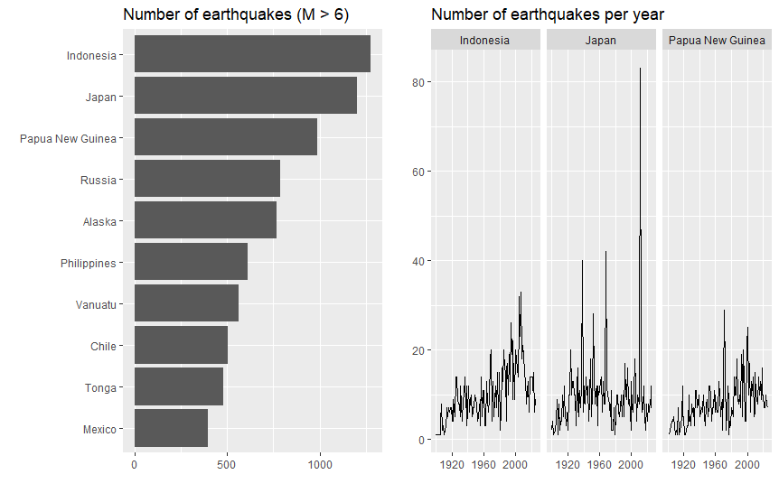 ざくっと各国の地震の発生頻度を見てみようと思い、アメリカ地質調査所(USGS)の地震データを引っ張ってきました。左パネルは1900~2026年(4/20まで)のマグニチュード6以上の地震の発生回数を国別に見たもの、右パネルは上位3カ国について、毎年の発生回数の推移を見たものです。アメリカの研究所なので、アメリカは州ごとになっており、トップ10にはアラスカが入っています。