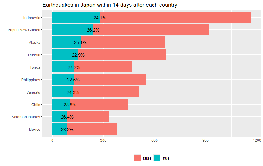 もちろんインドネシアやPNG等、地震の発生回数自体が多い国では、日本で続く回数も多くなるでしょうが、同時に発生しない偽信号の回数も多くなると思われます。この確率(=的中率)が高ければ、前兆指標として優秀だと言えます。グラフ中の「%」が、各国の的中率を計算したものです。あまり地震が発生しない地域を見ても仕方ないので、1900年以降の大地震発生回数が100回以上の国に絞って、日本で地震が発生した回数(TRUE)の上位10ヵ国・地域を選び、その的中率を計算したものです。