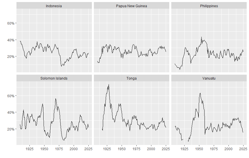 これだとピークは1925年頃の期間のトンガで、的中率は7割越えです。ただその後、何度か波はありつつ、近年の確率は水準を落として2~3割の間で行き来しています。バヌアツやソロモン諸島を含め、あまりに上下変動が大きい国は、やはりデータの不正確性が影響している可能性は念頭に置いたほうがいいかもしれません。