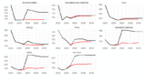 その後、足元の実績値の期間(2022年まで)では収束していきますが、それでも2グループに分かれた状況。また、その後のIMFの予測期間に入ると、むしろ3~4グループへとグループは分かれます。ただ足元の第2グループ(所得の低いグループ)の中から、高所得グループに入る国と低所得グループに入る国に分かれるというより、第1グループ(所得の高いグループ)の中から、勝ち組と負け組へ分化していくといったほうがよい感じです。