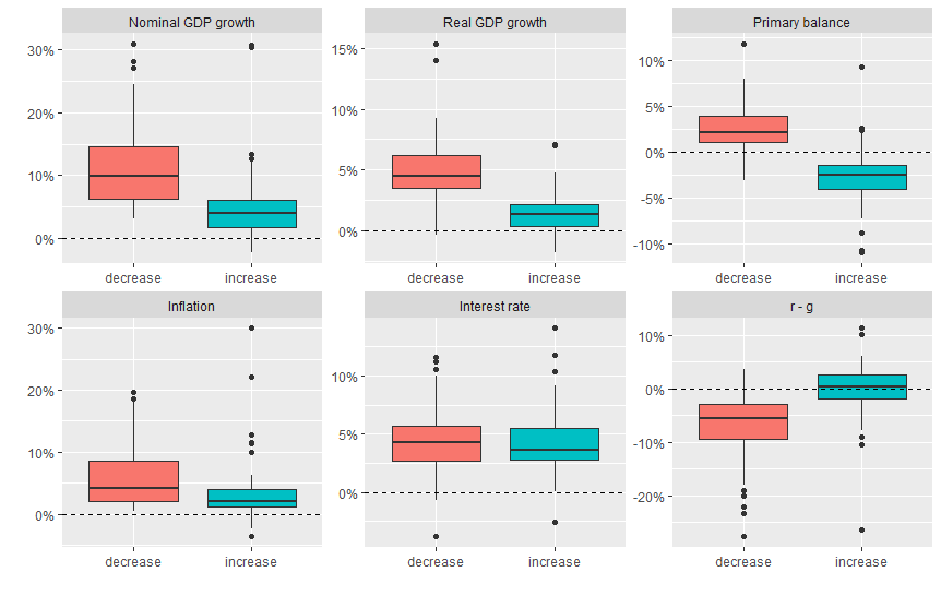 まず債務改善ケース(decrease)を見ると、圧倒的にr<gのケースが多く(61例)、r>gのケースは3例に過ぎません。債務悪化ケースでは、r>gが35例、r<gが31例と同じ程度なのを考えると、やはりr<gは債務安定化には非常に有利だと言えます。