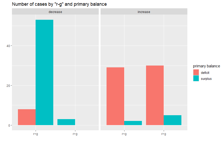 そこで気になるのが(私だけかもしれんが)、r<gであれば、PB赤字であっても債務安定化するという、都合のいい事態が存在するのかです。そこで全部で130のエピソードを債務改善ケース(decrease)と悪化ケース(increase)に分けて、r-gがプラスかマイナスか、その中でPBが赤字(deficit)か黒字(surplus)かで数を比べてみました。