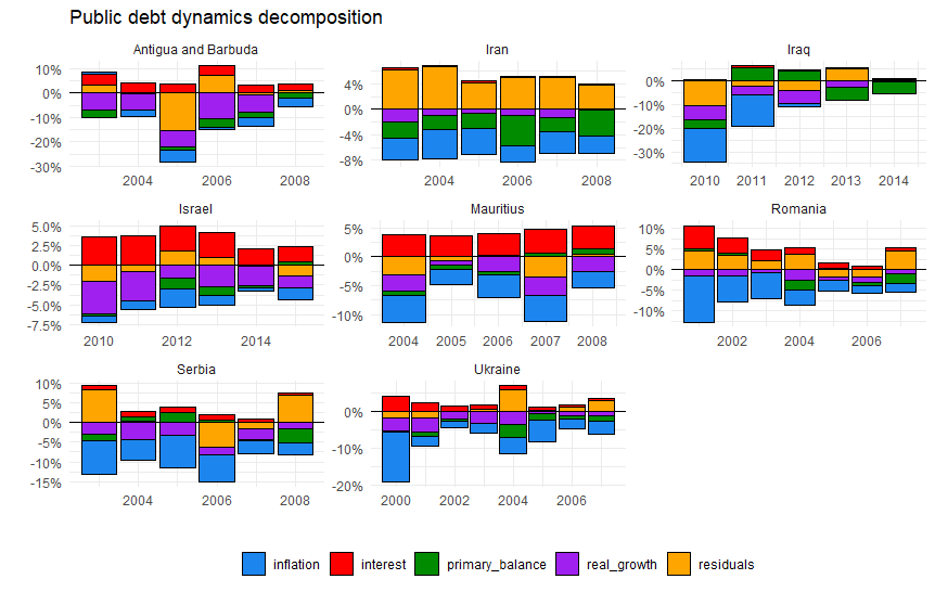 残差部分を無視すると、多くの場合でインフレ(青)が債務水準引き下げに大きな役割を果たしています。望ましい展開は、インフレ(青)よりも実質成長率(紫)がマイナス方向に大きく出ることで債務水準が低下するケースですが、比較的それが目立つのはアンティグア・バーブーダとイスラエルぐらいです。