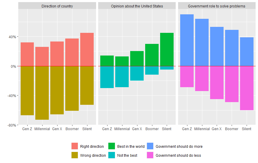 国が進んでいる方向については、世代が高くなるほどポジティブになる傾向が緩やかにありますが、ちょっと面白いのはミレニアルが最も悲観的で、ZとXは似たような傾向にあります。Z世代はまだ大学在学中の人口も多い一方、ミレニアルは労働市場に出ていて辛酸を嘗めているからかもしれませんが、他の質問では必ずしもこういう「底打ち」傾向は明らかではありません。