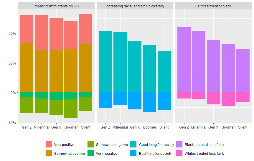これは人種的多様性や黒人の扱いについても同じ。これらの質問では、ポジティブな意見が世代とともに少なくなる傾向ですが、最も支持が低いサイレント世代でもプラスの意見のほうが圧倒的に多いです(これ以外に「特に違いはない」や「白人・黒人とも同じように扱われている」が、ほぼ同程度います)。