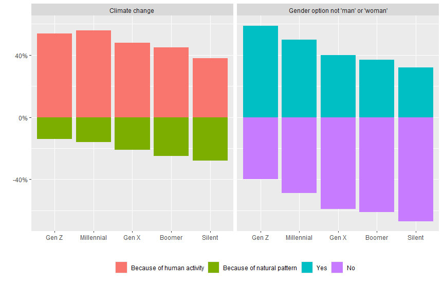 気候変動については、温暖化の原因が人間の活動か、自然の傾向かを比較します(これ以外に、「明確なエビデンスはない」「分からない」も選択肢にありますが)。やはり若い世代ほど人間の活動が原因とみる傾向は強いのですが、サイレント世代でも「人間の活動」への支持のほうが高くなっています。