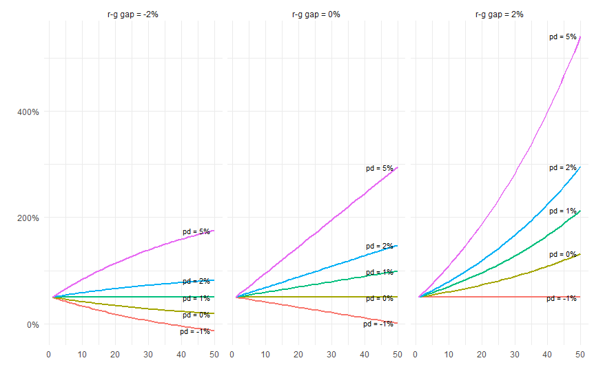 加えて、この議論はあくまで借入をする側の論理。債務水準がGDP比50%でも、200%でも、500%でもその金利での貸し手は十分にいるという前提。しかし、通常は債務水準が大きくなれば金利は上昇します。その場合、r<gからr>gに転じるかもしれません。つまり、当初はグラフの左パネルの世界にいると思っていたら、いつの間にか右パネルの世界に移って、債務が拡散する経路に乗ってしまっていた、ということを想定しないといけないわけです。