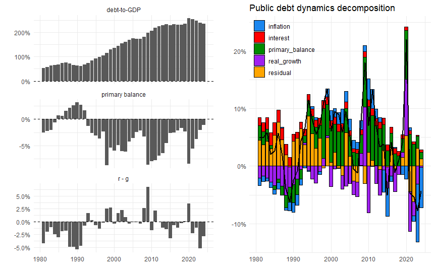 では日本の過去のデータで、r-gがどういう水準だったのか、PB、債務GDP比はどう推移したかを見てみます。左パネルは、IMF世界経済見通し(WEO)データベースによる1980~2024年の各変数の動き。国債金利rは、利払い額を前年の債務残高で割って逆算したものです。右パネルは、ドーマー式を用いて債務GDP比の変化を、経済成長、インフレ、PB、金利、その他へ要因分解したものです。