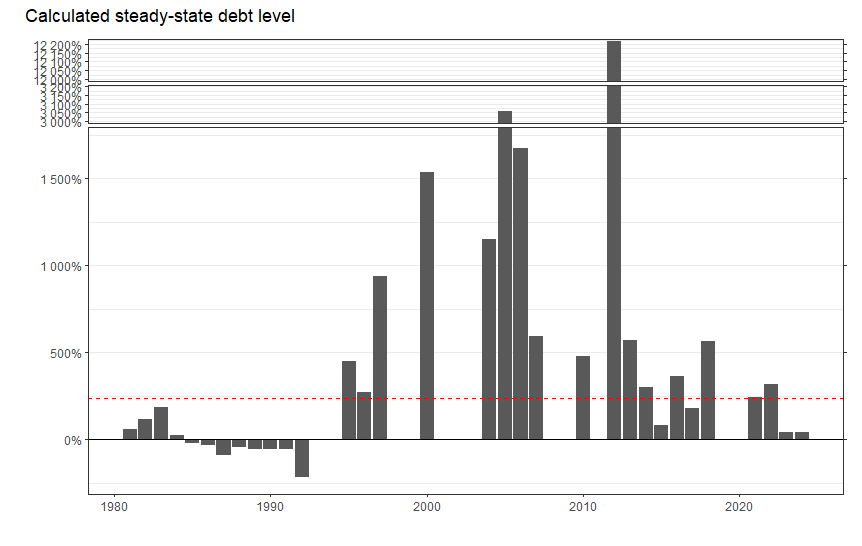 r<gの年もかなりあるのに、なんで債務がこんなに積みあがるんだ、定常状態に落ち着くんじゃないのか、と思うのですが、以下がr-gがマイナスの年について、その定常値を計算したものです。2006年や2012年のような異常な値があって見にくいため、グラフ縦軸を区切って、なんとか読み取れるように工夫をしてみました。