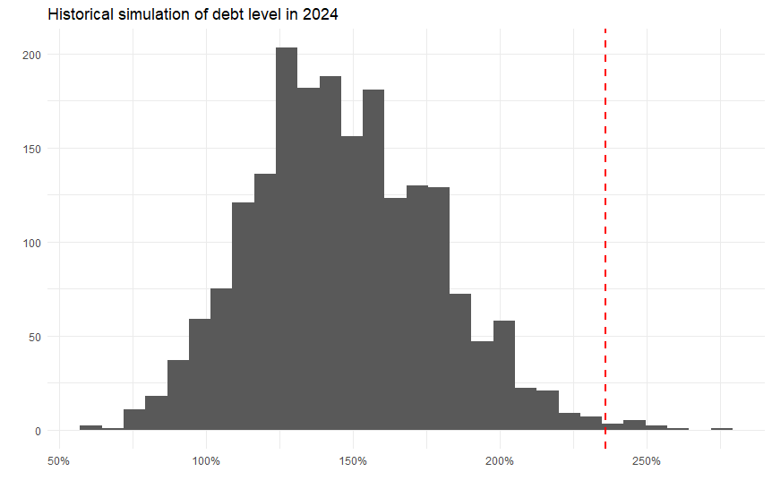 最後にちょっと過去の歴史のシミュレーションをやってみます。1980~2024年の金利、インフレ、実質GDP成長率、PBのデータをもとに、この4変数の分散・共分散を再現する形で乱数を発生させ、1980年末の債務残高(GDP比47.8%)が、2024年末までにどのような数字になるか、2000回計算してみました。