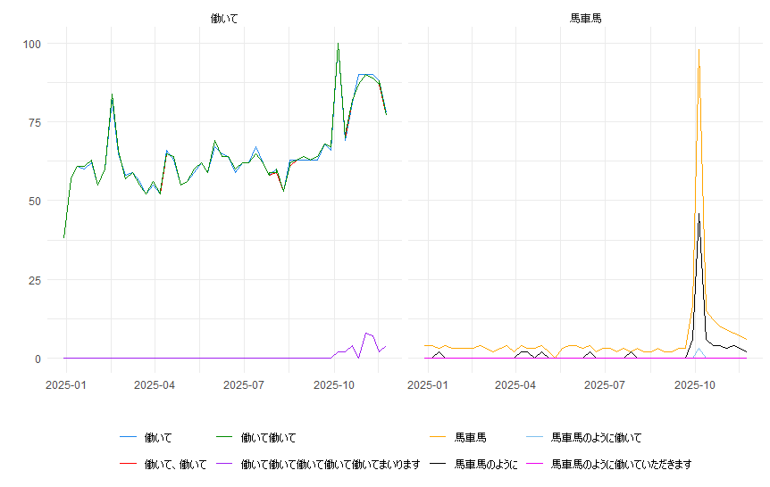 「馬車馬」も同じですね。「馬車馬のように働いていただきます」の検索はありませんが、「馬車馬」「馬車馬のように」の検索が10月第1週に急上昇します。これが高市総理発言の検索だと考えていいのでしょう。